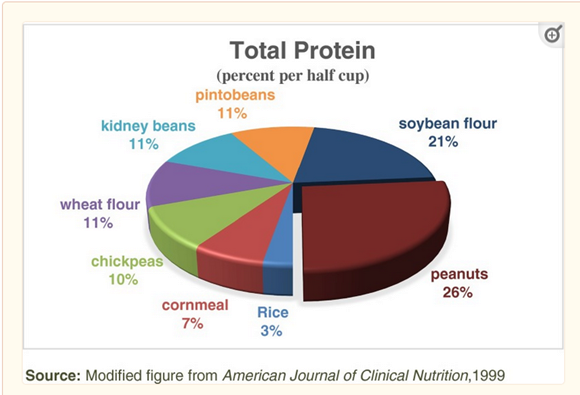 پروتئین کل در انواع غلات و حبوبات در هر نصف فنجان در ذیل آورده شده است. منبع: شکل اصلاح شده از مجله آمریکایی تغذیه بالینی، 1999